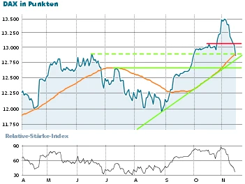 Sollte der DAX heute zum Tagesschluss die Unterstützung aus GD50 und Juni-Hoch (Schlusskurs) bei 12.880 Punkten brechen, dürfte er bis 12.640 Zähler fallen. Wird auch dort keine Trendwende eingeleitet, droht ein Absturz bis auf 12.428 Zähler (GD200).