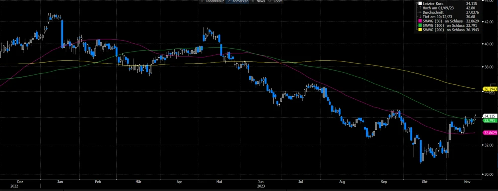 Bei einem Ausbruch über das Hoch vom 26. September können Anleger einen Kauf mit Stopp bei 33,80 Dollar wagen. Das erste Kursziel wäre das Erreichen des GD200 bei 36,22 Dollar.