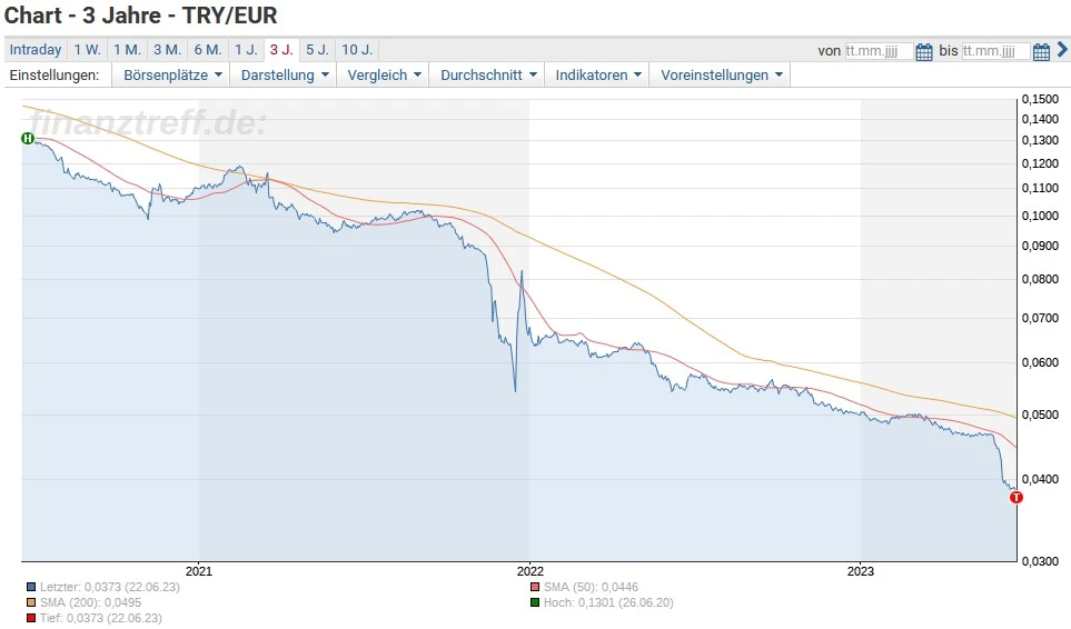 DER AKTIONÄR hatte bereits direkt nach der Wiederwahl Ende Mai geschrieben: „Die Lira bleibt demnach gegenüber Dollar und Euro klar im Abwärtstrend – was zumindest Devisen-Trader freuen dürfte.“ Offenbar misstrauen Marktteilnehmer nun dem Kurswechsel – oder die Zinsanhebung geht zumindest nicht weit genug, liegt sie doch immer noch deutlich unter der Inflation.