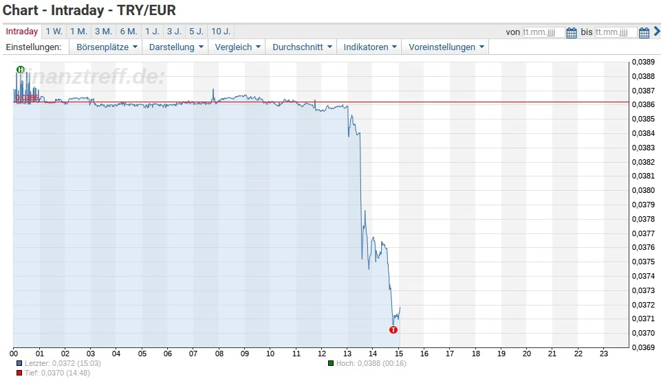 Der Lira hat die heutige Entscheidung nicht geholfen. Gegenüber dem Euro fiel die türkische Währung am Nachmittag auf ein neues Rekordtief.
