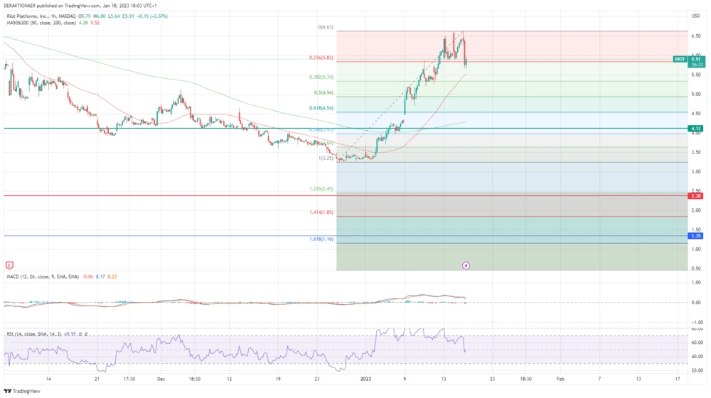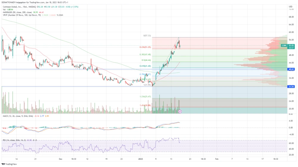 Typische Ziele in einer finalen Verkaufswelle sind die 141,4%- und das 161,8%-Fibonacci-Extensions der vorangegangen Bewegung. Bei Riot ergibt sich somit ein Zielbereich zwischen 1,85 und 1,16 Dollar. Bei Coinbase liegt er zwischen 20,88 und 15,62 Dollar.
