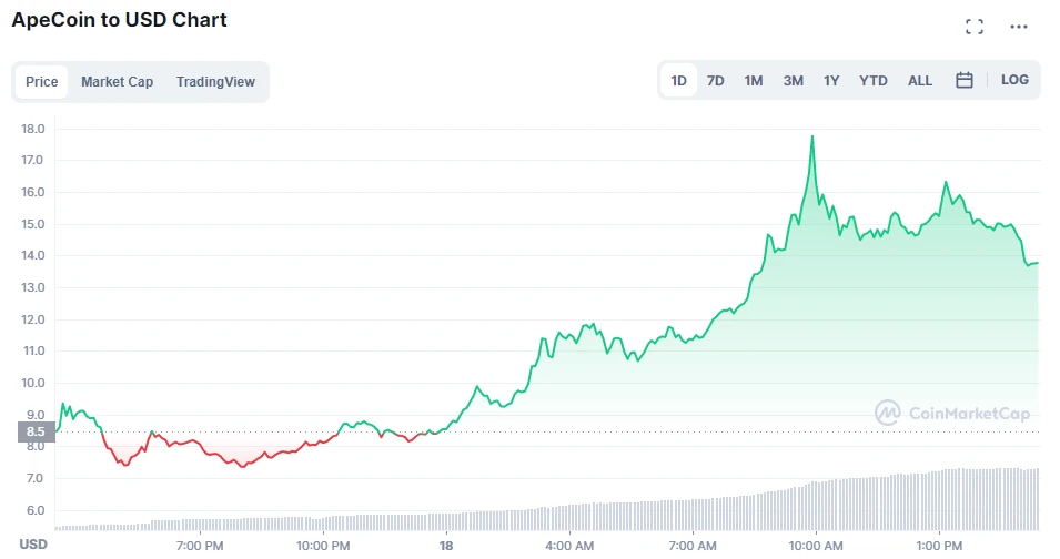 Zum Launch am gestrigen Donnerstag ist der Kurs des ApeCoins nach Daten des Branchenportals coinmarketcap.com quasi aus dem Stand von einem Dollar auf einen Höchststand von 39,40 Dollar explodiert. Anschließend ist er innerhalb weniger Stunden wieder bis auf 6,48 Dollar eingebrochen und arbeitet sich nun erneut nach oben.