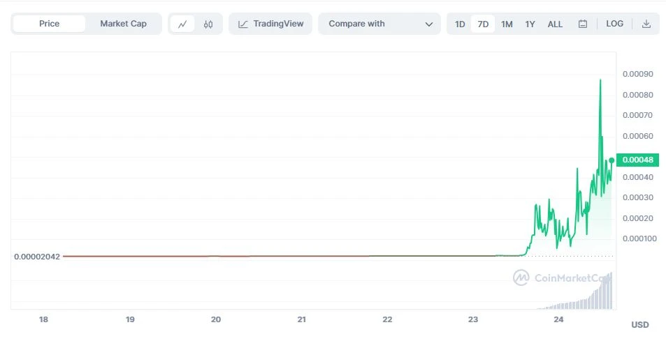Ähnlich ergeht es einem weiteren Token namens X, den die Entwickler auf ihrer Website als „revolutionären Meme Coin, inspiriert von Elon Musks Tweet“ preisen. Der Kurs bricht heute um rund 50 Prozent ein, nachdem er am Sonntag innerhalb weniger Stunden um mehr als 3.000 Prozent gestiegen war.