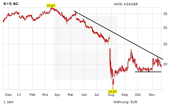 Am Donnerstag zählt K+S zu den schwächsten Werten im DAX. Investierte Anleger bleiben vorerst dabei. Bei einem Rutsch unter die 18-Euro-Marke sollte jedoch die Reißleine gezogen werden, da sich die charttechnische dann weiter eintrübt und ein Rutsch bis ans alte Bewegungstief bei rund 15 Euro droht.