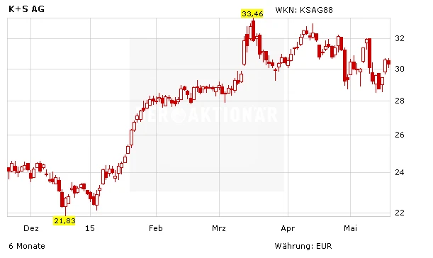 Analyst Lutz Grüten hat die Einstufung für K+S auf "Buy" mit einem Kursziel von 40,50 Euro belassen. Dies entspricht einem Aufschlag von etwa zehn Euro oder 34 Prozent auf den aktuellen Kurs. Grüten hob seine Gewinnschätzungen bis 2016 um bis zu sechs Prozent an. In seiner Studie begründete er dies mit den kürzlich vorgelegten, hervorragenden Ergebnissen des Unternehmens für das erste Quartal.