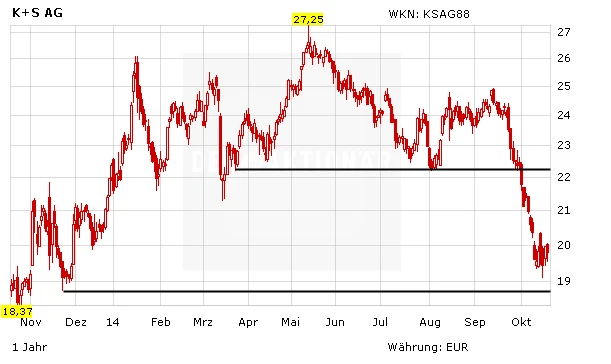 Der Markt überschätze die geringere Nachfrage des Agrarmarktes nach Produkten des Kali-Unternehmens, so Equinet-Analyst Michael Schäfer. Das sei auch der Grund, weshalb die Aktie seit Mitte September 20 Prozent verloren habe. Die Quartalszahlen am 13. November dürften nach seiner Ansicht die Befürchtungen jedoch widerlegen. Zuletzt hatte Barclays-Analyst Andreas Heine die Einstufung für die DAX-Aktie auf "Overweight" mit einem Kursziel von 26 Euro angehoben. Zwar hält er die Stimmung der Anleger weiterhin für angeschlagen, die Fundamentaldaten seien jedoch nach wie vor stark, so der Experte.