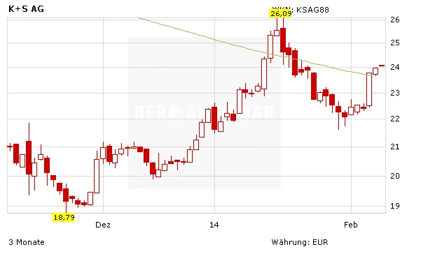 DER AKTIONÄR hat bereits erklärt, dass bei der K+S-Aktie aus charttechnischer Sicht weiter die Chance auf einen Zwischenspurt besteht. Die Unterstützung zwischen 21,60 und 22 dient dabei als Basis. Die 200-Tage-Linie knapp unter der 24-Euor-Marke hat auf dem Weg in Richtung des letzten Zwischenhochs bei 26,10 Euro wie erwartet kaum Widerstand geleistet.