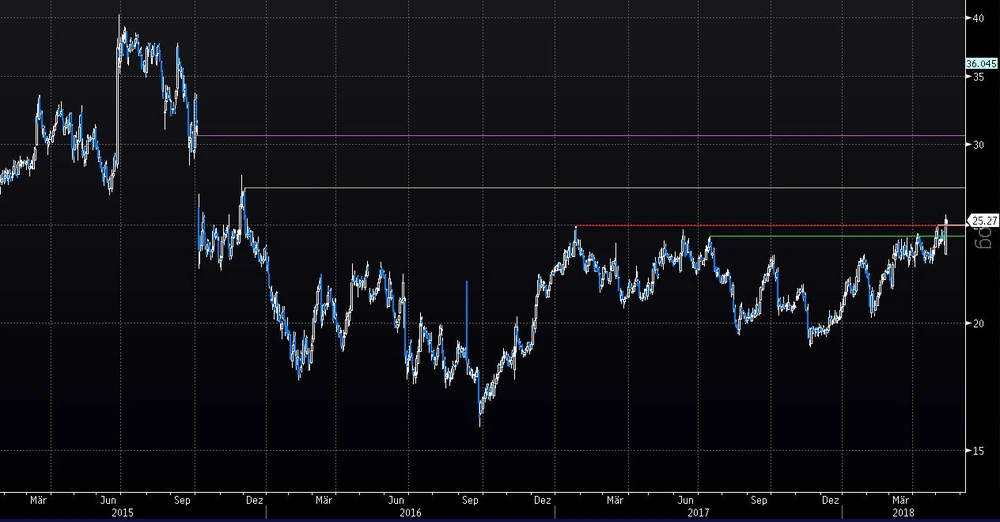 Rein charttechnisch betrachtet hätte die K+S-Aktie zunächst Luft nach oben bis in den Bereich um 28 Euro. Sollte auch diese Hürde genommen werden, dürfte anschließend das 2015 im Zuge der Rücknahme des Übernahmeangebots von Potash aufgerissene Gap geschlossen werden. Das nächste Ziel würde dann sogar 30,60 Euro lauten.