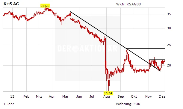 Es ist ruhig geworden um die Aktie des Kali- und Salzproduzenten K+S. Trotz des Wintereinbruchs liest man derzeit wenig über das Unternehmen, das einen Teil seines Gewinns mit Auftausalz einfährt. Doch die Aktie macht sich still und heimlich daran, einen Angriff auf das Zwischenhoch zu starten.