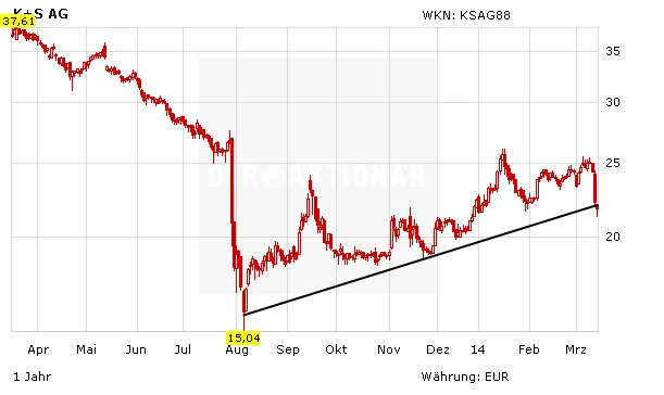 Die Krim-Krise hat den negativen Effekt der verhaltenen K+S-Prognose verschärft. Inzwischen notiert der Kurs nur noch knapp oberhalb der Unterstützung von 21,50 Euro. Fällt diese Marke, gerät auch der seit August 2013 gültige Aufwärtstrend in Gefahr. In diesem Fall drohen weitere Abverkäufe bis zur 20-Euro-Marke.