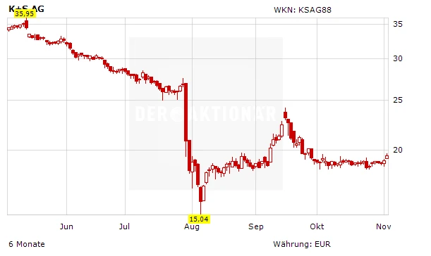 K+S wird am Donnerstag, 14. November, Zahlen für das abgelaufene dritte Quartal präsentieren. Und die dürften alles andere als gut ausfallen: Der kanadische Konkurrent Potash hat bereits zweimal eine Gewinnwarnung ausgeprochen. Zum einen waren die Kalipreise deutlich gesunken, zum anderen hielten sich auch die Käufer zurück.