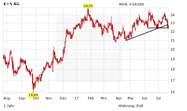 So beziffert Experte Michael Schäfer den fairen Wert der MDAX-Titel auf 30,00 Euro, was 34 Prozent über dem aktuellen Kursniveau liegt. Dementsprechend rät er weiterhin zum Kauf der K+S-Aktien. Er betonte, dass die Preisvereinbarung des Exportkartells Canpotex mit China eine Art Boden für die Kalipreise schaffen würde. Indes würde der schwache US-Dollar das Konzernergebnis zwar kurzfristig eher belasten, für das Gesamtjahr sei K+S aber abgesichert.