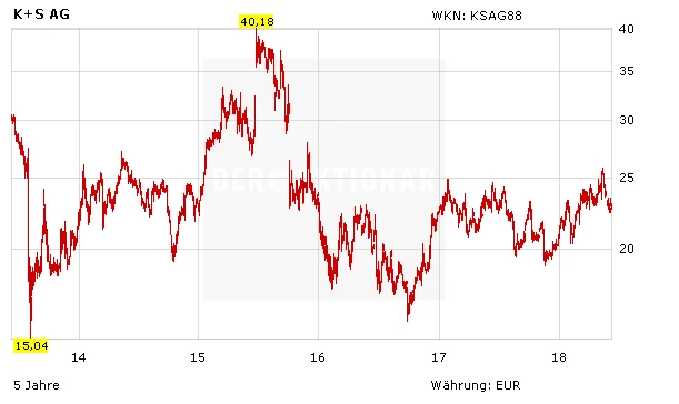 Derzeit wird davon ausgegangen, dass der Düngemittel- und Salzproduzent den Umsatz im laufenden Jahr von 3,6 auf 4,1 Milliarden Euro steigern kann. Beim EBITDA liegen die durchschnittlichen Prognosen bei 813 Millionen Euro (Vorjahr: 577 Millionen Euro), beim Gewinn je Aktie bei 1,44 Euro (2017: 0,96 Euro). Die Nettoverschuldung dürfte Ende des Jahres – voraussichtlich ein letztes Mal – weiter zulegen (von 3,0 auf 3,2 Milliarden Euro) und soll laut CEO Burkhard Lohr über die kommenden Jahre hinweg wieder deutlich sinken.