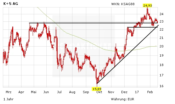 Die Aktie von K+S bleibt ein heißes Eisen. Wer allerdings über Mut verfügt, kann angesichts der sich allmählich aufhellenden Perspektiven sowie des aussichtsreichen Chartbildes zugreifen. Der Stoppkurs sollte bei 19,00 Euro platziert werden.