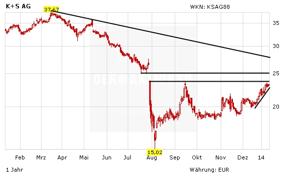 Nach dem Katastrophenjahr 2013 bereitet die Aktie des Kali- und Salzproduzenten K+S Anlegern zum Jahresauftakt wieder Freude. Das Papier hat in den vergangenen Tagen zulegen können. Der Chart sieht weiterhin bullish aus. Das große Kaufsignal rückt damit in greifbare Nähe. DER AKTIONÄR bleibt mit seiner Tradingposition an Bord.