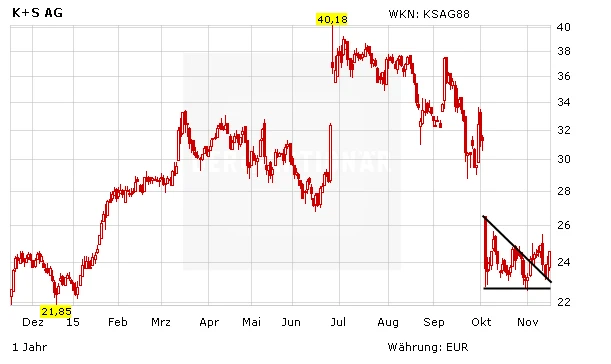 So hat die Privatbank Hauck & Aufhäuser das Kursziel für die K+S-Aktie nach einer Kapitalmarktveranstaltung von 40,50 auf 39,00 Euro gesenkt. Dies liegt fast 60 Prozent über dem aktuellen Kursniveau. Dementsprechend wurde die Einstufung auf "Buy" belassen. Analyst Nils-Peter Gehrmann betonte, ungeachtet der kurzzeitig eingetrübten Aussichten bleiben die langfristigen Perspektiven im Kalimarkt seiner Ansicht nach positiv. Hinzu kommen Fortschritte bei einer neuen Kalimine in Kanada, der gesunde Ergebnisbeitrag des Salzgeschäfts und die attraktive Bewertung der Aktie. Zudem „tröste“ die hohe Dividendenrendite über schwierige Zeiten hinweg.