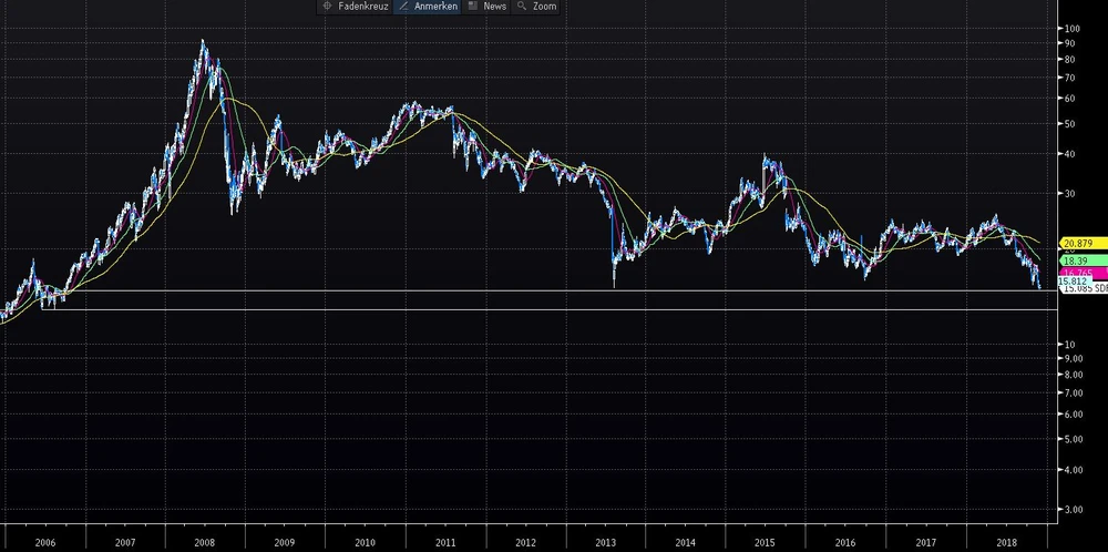 Rein charttechnisch betrachtet steht aktuell natürlich die 15,00-Euro-Marke im Fokus. Sollte diese nicht gehalten werden, droht ein Test des bisherigen Jahrestiefs bei 14,83 Euro. Darunter liegt erst im Bereich der 14-Euro-Marke die nächste Unterstützung – übrigens aus dem Jahre 2006! Sollte auch dieser Support keinen Halt geben, wäre ein Absinken bis auf 12,80 Euro wahrscheinlich.