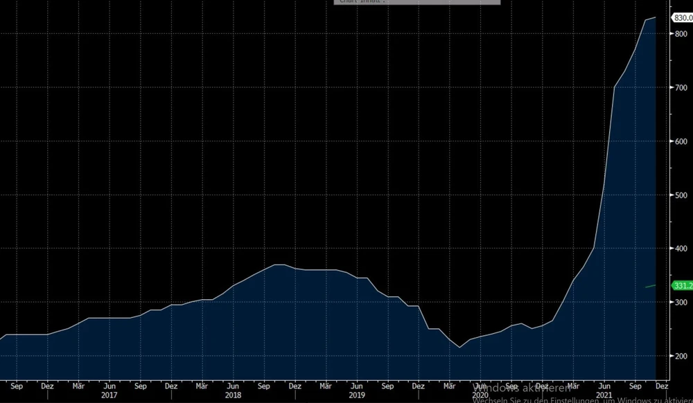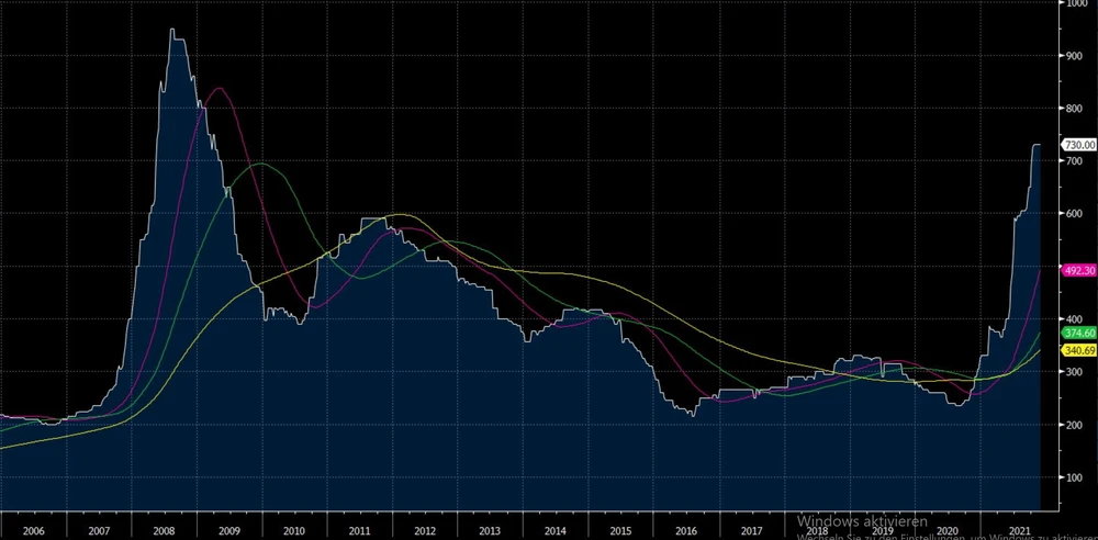 Auch in den USA müssen Farmer, die ihre Ernte mithilfe von Kalidünger steigern wollen, nun deutlich tiefer in die Tasche greifen. Mit aktuell 730 Dollar liegt der Preis so hoch wie zuvor lediglich im Jahre 2008 - damals kostete eine K+S-Aktie übrigens im Hoch kurzzeitig knapp 90 Euro (siehe Chart ganz unten).