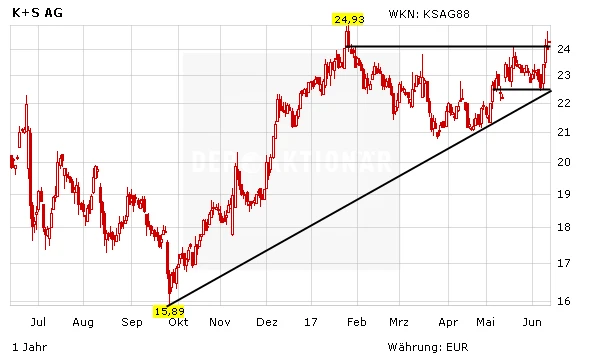 Die Aktie von K+S schlägt sich indes weiter wacker. Für Rückenwind könnten in den kommenden Handelstagen die gute Meldung aus Kanada sowie das freundliche Chartbild sorgen. Dennoch wären deutlich höhere Kalipreise gerade für K+S (der Konzern verfügt im internationalen Vergleich über relativ hohe Förderkosten) natürlich Gold wert. Solange dies nicht so ist, bleibt der MDAX-Titel nur für mutige Anleger geeignet (Stopp: 19,00 Euro).