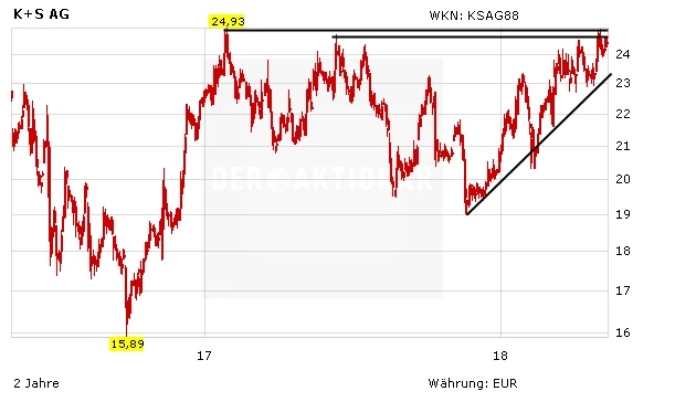 Die Aussichten für K+S hellen sich angesichts allmählich wieder höherer Kalipreise sowie einer stetig steigenden Produktion weiter auf. Auch das Chartbild stimmt positiv. Allerdings bleiben die Risiken der volatilen Kalipreise, der Unwägbarkeiten für die Fördermöglichkeiten der Minen in Deutschland und Kanada sowie der hohen Nettoverschuldung von knapp drei Milliarden Euro. Daher bleibt die Aktie nur für mutige Anleger geeignet (Stopp: 19,50 Euro).