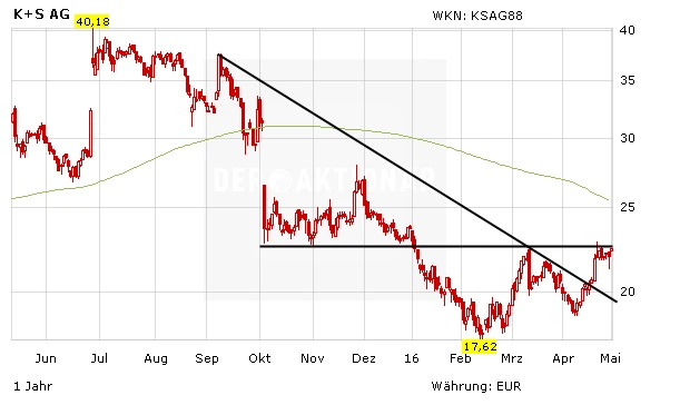 Aufgrund der mittel- bis langfristig guten Perspektiven können mutige Anleger bei der Aktie von K+S nach wie vor an Bord bleiben. Die Position beim mitunter sehr volatilen MDAX-Titel sollte mit einem Stoppkurs bei 17,50 Euro abgesichert werden.