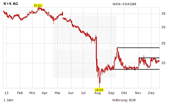 Das US-Analysehaus Bernstein Research hat die Einstufung für K+S auf „Underperform“ mit einem Kursziel von 12 Euro belassen. Im europäischen Chemiesektor seien erstmals seit zwei Jahren die Produktionsvolumina im Oktober wieder gestiegen, schrieb Analyst Jeremy Redenius in einer Studie vom Donnerstag. Die Düngemittel-Produktion sei allerdings gesunken. In diesem Markt seien Käufe aufgeschoben worden. Dies habe offenbar belastet.