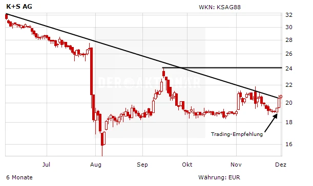 DER AKTIONÄR hatte Mitte vergangener Woche risikobewussten Anlegern eine Long-Position bei K+S ans Herz gelegt. Der Trade ist bislang voll aufgegangen. Der wichtigste Widerstand wartet bei 23,70 Euro auf die Aktie. Stoppkurs eng nachziehen!