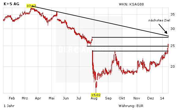 Wie üblich nimmt der Aktienmarkt eine Erholung bereits vorweg. Und das zeigt sich eindrucksvoll an der K+S-Aktie. Vom Tief im Sommer vergangenen Jahres bei 15,03 Euro hat die Aktie mittlerweile knapp 70 Prozent zulegen können. Vor allem in den vergangenen drei Tagen hat die Aktie noch einmal Gas gegeben. Das erste Kursziel des AKTIONÄRs bei 25,00 Euro wurde sogar übertroffen. Ein Rücksetzer in den kommenden Tagen wäre angesichts des Kursanstiegs fast wünschenswert. Investierte Anleger halten an ihrer Position fest und lassen die Gewinne laufen. Angesichts des leicht überhitzten Charts sollten noch nicht investierte Anleger einen Kauf bis zu einem Rücksetzer zurückstellen.