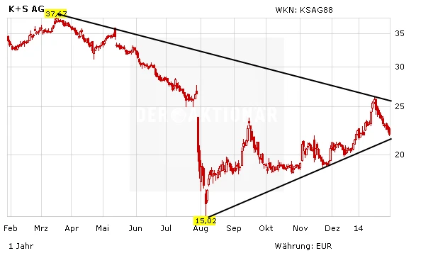 Der Abwärtsdruck bei der Aktie des Kali- und Salzproduzenten K+S verstärkt sich. Der kanadische Kaliproduzent Potash hat den Markt enttäuscht. Dazu hat das Unternehmen auch nur einen verhaltenen Ausblick für das Gesamtjahr gegeben. Die Nachfrage zieht offensichtlich nur langsam an.