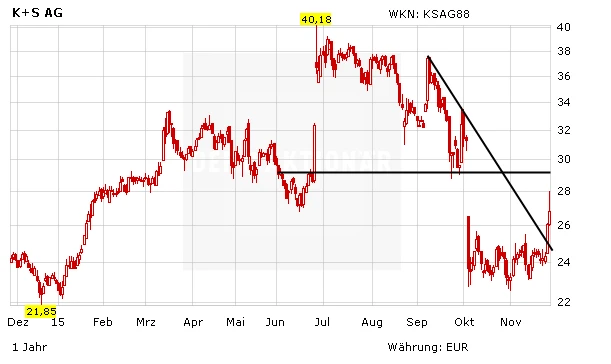 Am Mittwoch hatte der Börsenbrief Platow Brief Vermutungen über einen erneuten Übernahmeversuch angestellt. Im Tagesverlauf stieg die Aktie daraufhin um gut acht Prozent. Entgegen der Erwartungen vieler Experten kam es aber nicht zur Korrektur. Im Gegenteil: In der Spitze legte der Titel noch einmal rund sieben Prozent zu. Mittlerweile hat sich die Lage zwar etwas beruhigt, dennoch zählt K+S mit einem Plus von knapp vier Prozent weiter zu den Top-Gewinnern im DAX.