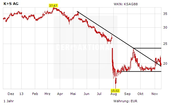 Das Düsseldorfer Bankhaus Lampe hat K+S nach Zahlen von „Halten“ auf „Kaufen“ hochgestuft und das Kursziel von 19 auf 26 Euro angehoben. Gemäß einer Studie vom Freitag rechnet Analyst Marc Gabriel in nächster Zeit mit einer Stabilisierung der Preise im Kali- und Magnesiumsegment, bei anhaltend hohen Absatzvolumina. Zudem dürfte das angekündigte Sparprogramm die Ertragslage von K+S verbessern.