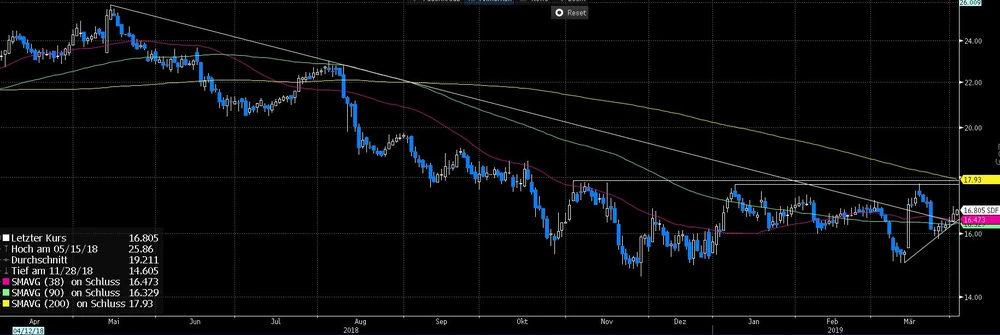 So konnte die 16-Euro-Marke verteidigt werden, wodurch sich zuletzt ein kurzfristiger Aufwärtstrend etablieren konnte. Zudem ist erneut der Ausbruch aus dem langfristigen Abwärtstrend gelungen. Nun wäre rein charttechnisch betrachtet der Weg nach oben zunächst frei. Im Bereich zwischen 17,75 und 17,87 Euro lauern allerdings immer noch hartnäckige Hürden. Es dürfte spannend werden, ob dieser Bereich beim nächsten Ablauf dann endlich überwunden werden kann.
