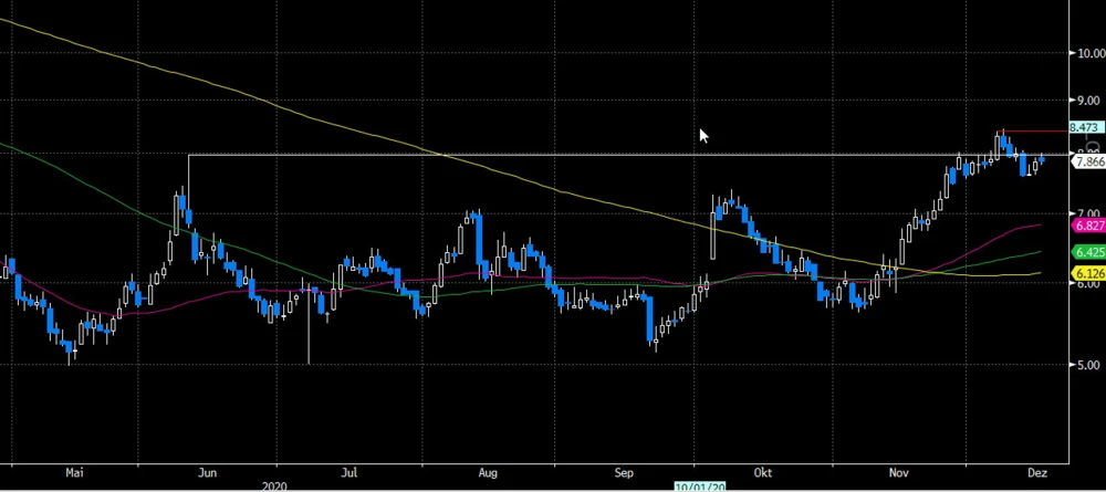 Sollte der Sprung über diese Hürde gelingen, dann wäre zunächst der Weg nach oben frei bis zur Marke von 8,44 Euro, dem bisherigen Erholungshoch. Sollte auch noch diese Marke genommen werden, wäre der Weg nach oben bis 9,50 Euro frei. Glückt der Ausbruch nicht, so bieten die Marken bei 7,59 Euro und 7,44 Euro Halt.