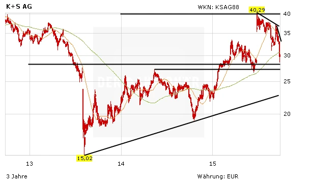 Im Chartbild von K+S sollten das Hoch von Juli 2007 bei 28,10 Euro, das Hoch von Mai 2014 bei 27,25 Euro und die seit August 2013 gültige Aufwärtstrendlinie bei 23,10 Euro absichern. Ein erstes Kaufsignal würde erzeugt, wenn die steigende 200-Tagelinie bei derzeit 30,70 Euro überwunden würde. Ein weiteres, diesmal schwaches Kaufsignal, kommt beim Überwinden der seit September 2015 intakten Abwärtsbewegungslinie bei 32,85 Euro zustande und das nächste kommt, wenn der Kurs über die sinkende 38-Tagelinie bei 34,45 Euro steigt.