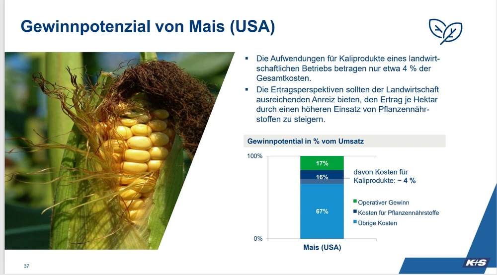 Und zweitens lohnt es sich auch, einen Blick auf die Kostenstruktur eines typischen landwirtschaftlichen Betriebs zu werfen. So machen die Kosten für Kali etwa bei Maisbauern in den USA lediglich vier Prozent der Gesamtkosten aus.