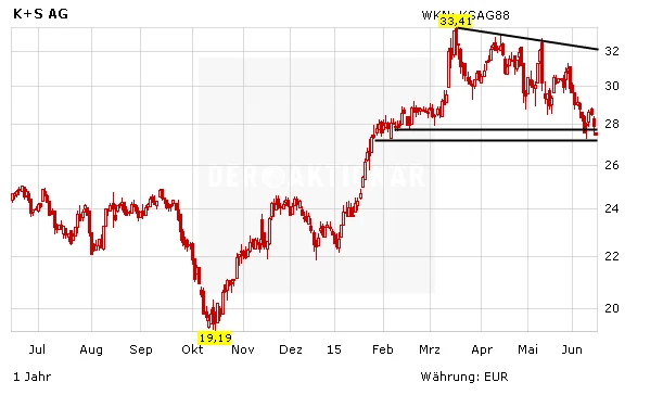 DER AKTIONÄR bleibt für die Aktie von K+S weiterhin zuversichtlich gestimmt. Die Perspektiven für den Düngemittel- und Salzhersteller bleiben gut, die Bewertung ist mit einem KG von 11 und einer Dividendenrendite von fast vier Prozent niedrig. Noch nicht investierte Anleger sollten vor einem Einstieg allerdings noch abwarten. Wer die Aktie bereits hat beachtet den Stoppkurs bei 27,00 Euro.
