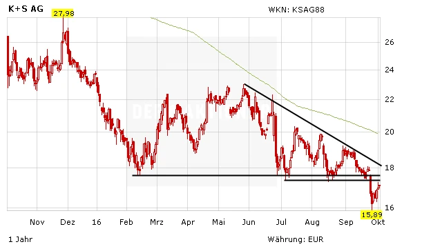 So hat Baader-Bank-Analyst Markus Mayer die Einstufung für die Aktien von K+S nach einer Investorenveranstaltung auf "Buy" mit einem Kursziel von 24 Euro belassen. Er erklärte, der designierte Finanzchef Thomas Boecker habe zahlreiche Gerüchte und Missverständnisse rund um die Kapitalsituation, das Legacy-Projekt in Kanada und die Ausfälle wegen der Abwasserversenkung in die Werra entkräftigt. Mayer betonte zudem erneut, dass ein Großteil der aktuellen Probleme seiner Ansicht nach im Kurs bereits eingepreist sein sollte und die Aussicht auf positive Nachrichten am Markt unterschätzt werde.