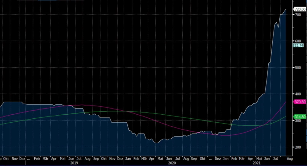 Denn in Brasilien setzen die Kalipreise ihre fast schon etwas unheimliche Rekordjagd fort. So markierte eine Tonne Kali dort mit 720 Dollar nun einen neuen Höchststand. Zum Vergleich: Im Frühjahr 2020 kostete der Dünger lediglich rund 220 Dollar, Anfang 2021 waren es auch erst 250 Dollar.