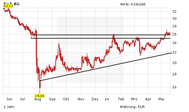 Die Investmentbank Equinet hat die Einstufung für K+S nach einer Investorenveranstaltung auf „Accumulate“ mit einem Kursziel von 30 Euro belassen. Die Veranstaltung des Salz- und Düngemittelherstellers habe zuversichtlich gestimmt, schrieb Analyst Michael Schäfer in einer Studie. Der Experte geht weiter davon aus, dass das operative Ergebnis (EBIT) des Unternehmens in diesem Jahr besser ausfallen wird als vom Markt erwartet.