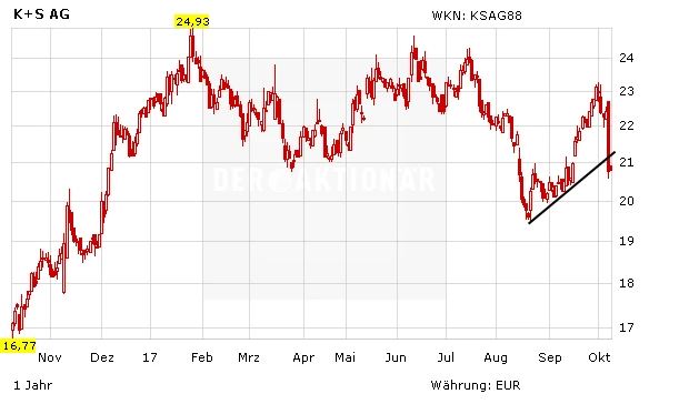 Insgesamt raten von den 29 Analysten, die sich regelmäßig mit der K+S-Aktie befassen, derzeit nur sieben zum Kauf. 13 stufen die Papiere mit Halten ein, neun empfehlen Anlegern den Verkauf. Das durchschnittliche Kursziel liegt mit 20,69 Euro nun ganz knapp unter dem gestrigen Schlusskurs.