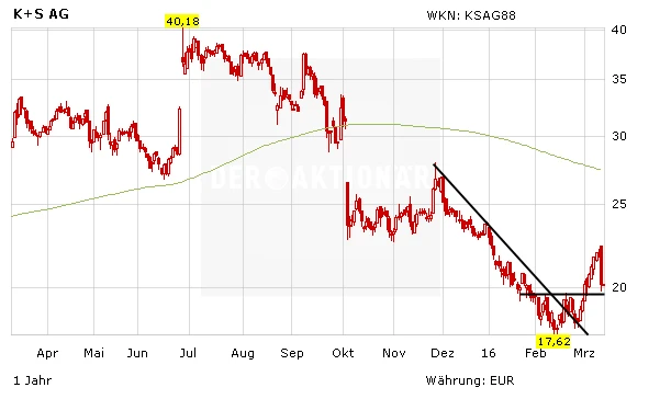Hingegen hat das Düsseldorfer Bankhaus Lampe die Einstufung für die Papiere von K+S auf "Halten" belassen und sieht das Kursziel nur bei 20 Euro. Analyst Marc Gabriel betonte, das operative Ergebnis (Ebit I) habe das untere Ende der Zielspanne des Düngerherstellers erreicht. Positiv überrascht habe der vorgeschlagene Dividendenanstieg.