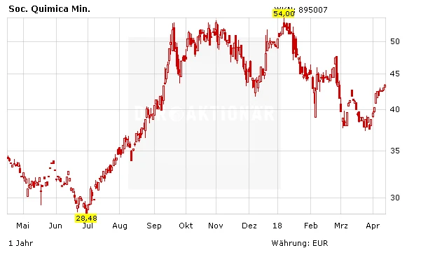 Auch der Aktie von Sociedad Quimica y Minera de Chile, kurz SQM, trauen Experten höhere Kurse zu. Der Kurs des Konzerns, der auch der weltgrößte Lithium-Hersteller ist, befindet sich nach beeindruckender Rallye nun in einer Konsolidierungsphase. Diese können langfristig orientierte Anleger zum Einstieg nutzen. Denn SQM dürfte in Zukunft Umsätze und Gewinne stetig steigern. Ein bedeutender Konkurrenz-Vorteil von SQM: Es stellt vor allem Kaliumsulfat (SOP) her, während K+S und Co eher Kaliumchlorid (MOP) produzieren. Für SOP werden derzeit am Markt teilweise fast doppelt so hohe Preise bezahlt, wodurch die Chilenen mit Gewinnmargen von mehr als 30 Prozent glänzen können. Gepaart mit der soliden Bilanz und der starken Stellung in attraktiven Märkten macht dies die SQM-Aktie zu einem Kauf.