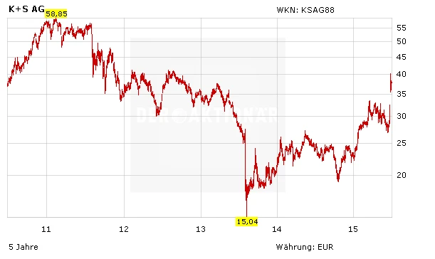 Analyst Nils-Peter Gehrmann betonte, die Wahrscheinlichkeit für eine Übernahme durch den Konkurrenten Potash sei deutlich höher als beim ersten Versuch 1997. Potash erziele keine Umsätze in Europa und der Marktanteil von K+S liege bei rund 30 Prozent. Daher dürfte es keine Einwände der Wettbewerbshüter geben. Der im Raum stehende Übernahmepreis von 40,75 Euro je Aktie sei aber zu niedrig.