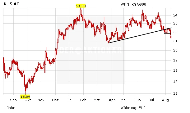 Umweltprobleme bei den deutschen Werken, die Unsicherheit über die Rentabilität der neuen Mine in Nordamerika sowie anhaltend niedrige Kalipreise sind allesamt nicht zu unterschätzende Risikofaktoren für die Aktie von K+S. Zudem ist das Chartbild derzeit angeschlagen. Daher drängt sich ein Einstieg vor den Zahlen aktuell nicht auf. Wer die Aktien bereits besitzt, sollte den Stopp bei 19,00 Euro beachten.