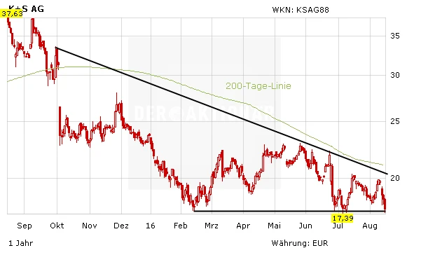 Es wundert nicht, dass der Kurs der K+S-Aktie auch zum Wochenstart mit einem Minus reagiert. Angesichts der vielfältigen Probleme des Kali-Riesen K+S und dem anhaltenden Abwärtstrend der Aktie zum Wochenstart ist von einer Anlage abzuraten.