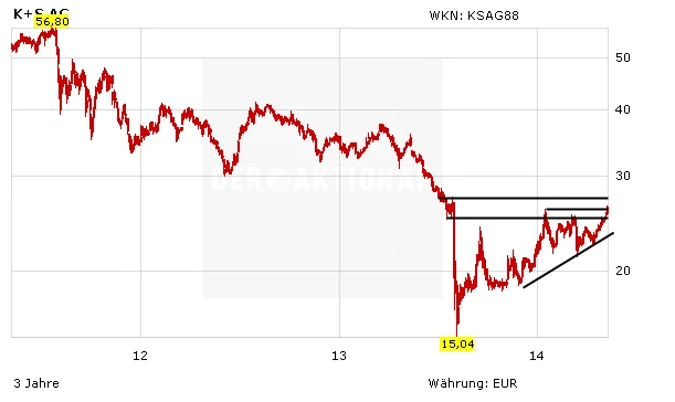 Die Privatbank Berenberg hat das Kursziel für K+S vor Zahlen von 15 auf 16 Euro angehoben, aber die Einstufung auf „Sell“ belassen. Er habe seine Schätzungen für den Salz- und Düngemittelhersteller angehoben, um seine Erwartungen für ein solides erstes Quartal zu berücksichtigen, schrieb Analyst John Philipp Klein in einer Studie. Allerdings erscheine die Aktie auch auf Basis seiner neuen Annahmen hoch bewertet.