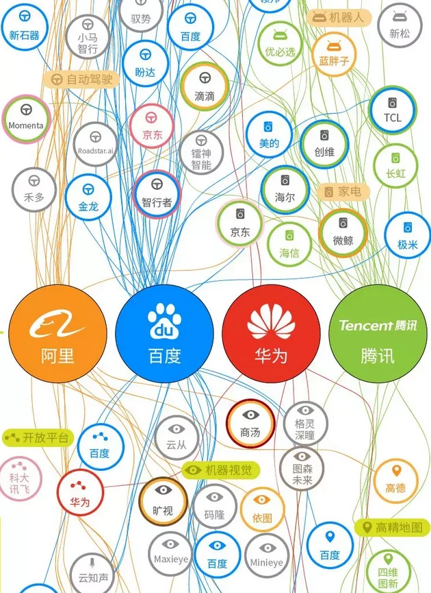 Innerhalb der chinesischen KI-Branche tummeln sich annähernd 200 Firmen, die sich mit dem Thema befassen, doch vier stechen aus der Masse heraus: Baidu, Alibaba, Tencent und Huawei. Das Quartett ist nicht nur Teil der Branche, sondern kontrolliert sie. Ermöglicht wird dies durch vielfältigen Verflechtung aus Geschäftsbeziehungen und Investitionen.