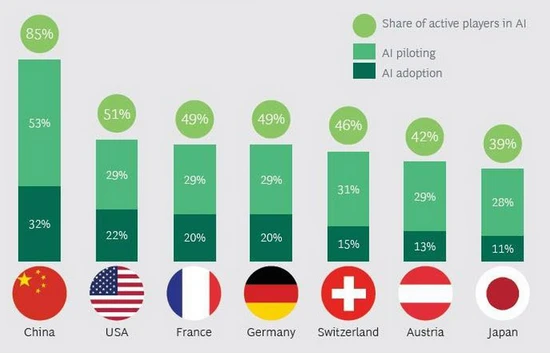 Klar ist hingegen: Bei der KI geben chinesische Tech-Konzerne den Ton an. In einer Studie kommt die Boston Consulting Group zu dem Ergebnis: "85 Prozent der chinesischen Unternehmen sind aktive Akteure im Bereich der KI, das Land führt damit die sieben untersuchten Nationen an."