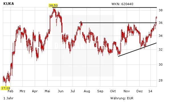 Die KUKA-Aktie setzt sich am Donnerstag an die Spitze der Gewinnerliste im MDAX. Bereits am gestrigen Mittwoch sind die Papiere des Industrieroboterherstellers über den horizontalen Widerstand bei 36,00 Euro geklettert und haben ein neues Kaufsignal ausgelöst.