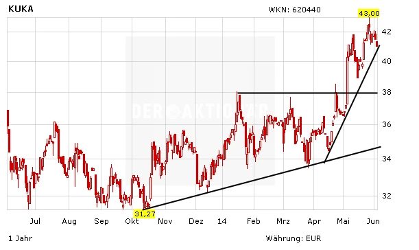 Der Experte hat KUKA von „Hold“ auf „Reduce“ abgestuft, das Kursziel aber von 34 auf 36 Euro angehoben. Die jüngst überdurchschnittliche Kursentwicklung erscheint laut Schmidt übertrieben. 2014 werde für den Roboter- und Anlagenbauer ein Jahr der Investitionen mit steigenden Forschungs- und Entwicklungskosten, verstärkter Absatzbemühungen und der Konsolidierung von Reis Robotics. Dazu stärke die Abwertung des Yen seit Mitte 2012 die Wettbewerbsfähigkeit der japanischen Konkurrenten Fanuc und Yaskawa.